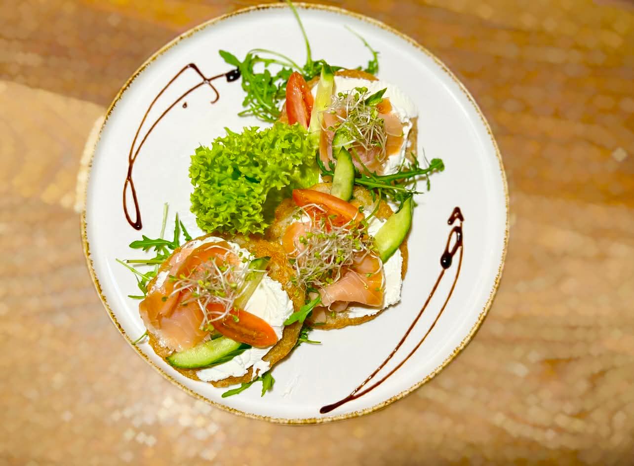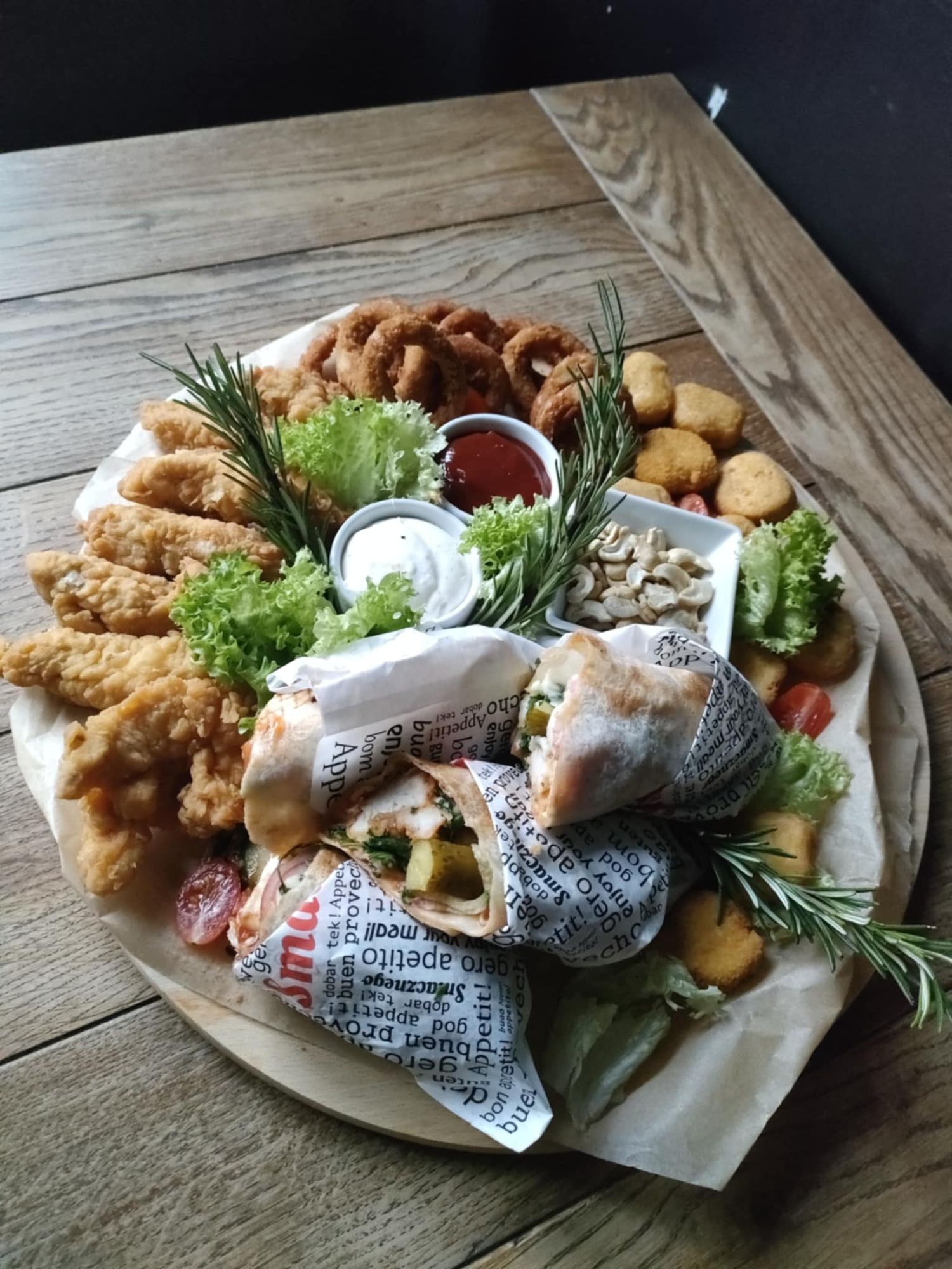 polędwiczka z kurczaka w chrupiącej panierce/ chipsy bekonowe/ pomidor/ogórki/czerwona cebula/ mozzarella/ salsa/lodowa/rukola