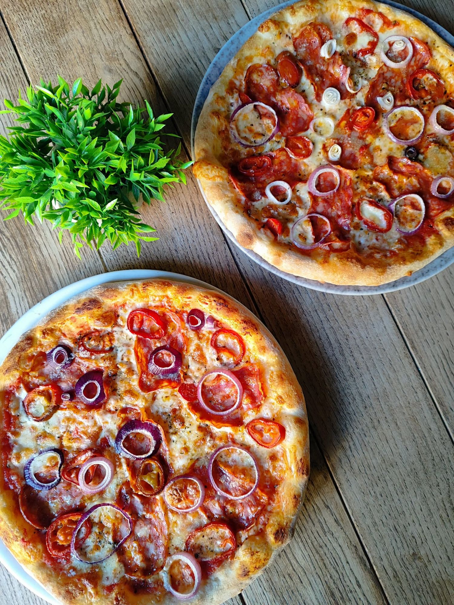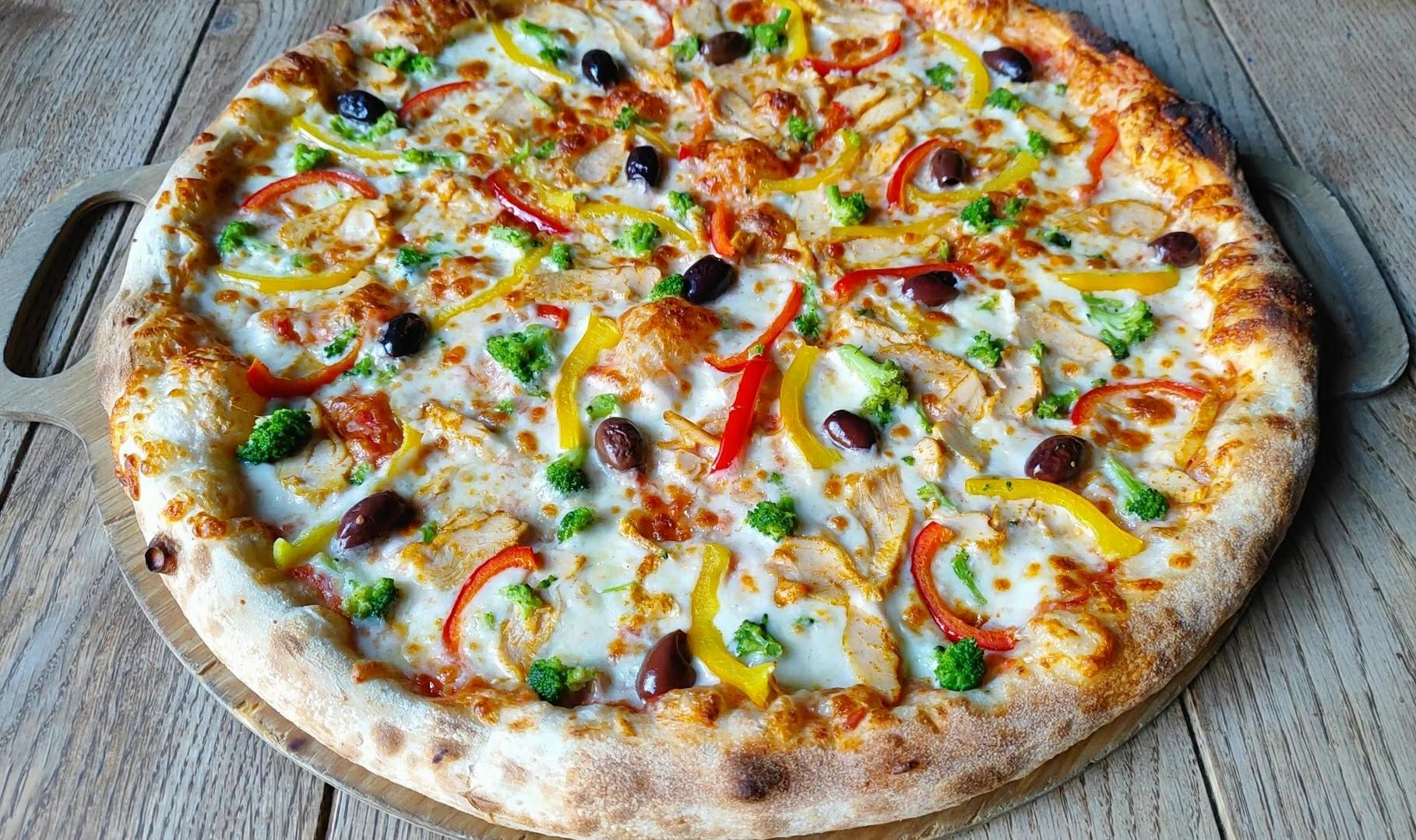 sos pomidorowy z pomidorków pelati, mozzarella, chorizo, oliwki , cebula czerwona, papryka świeża, czosnek