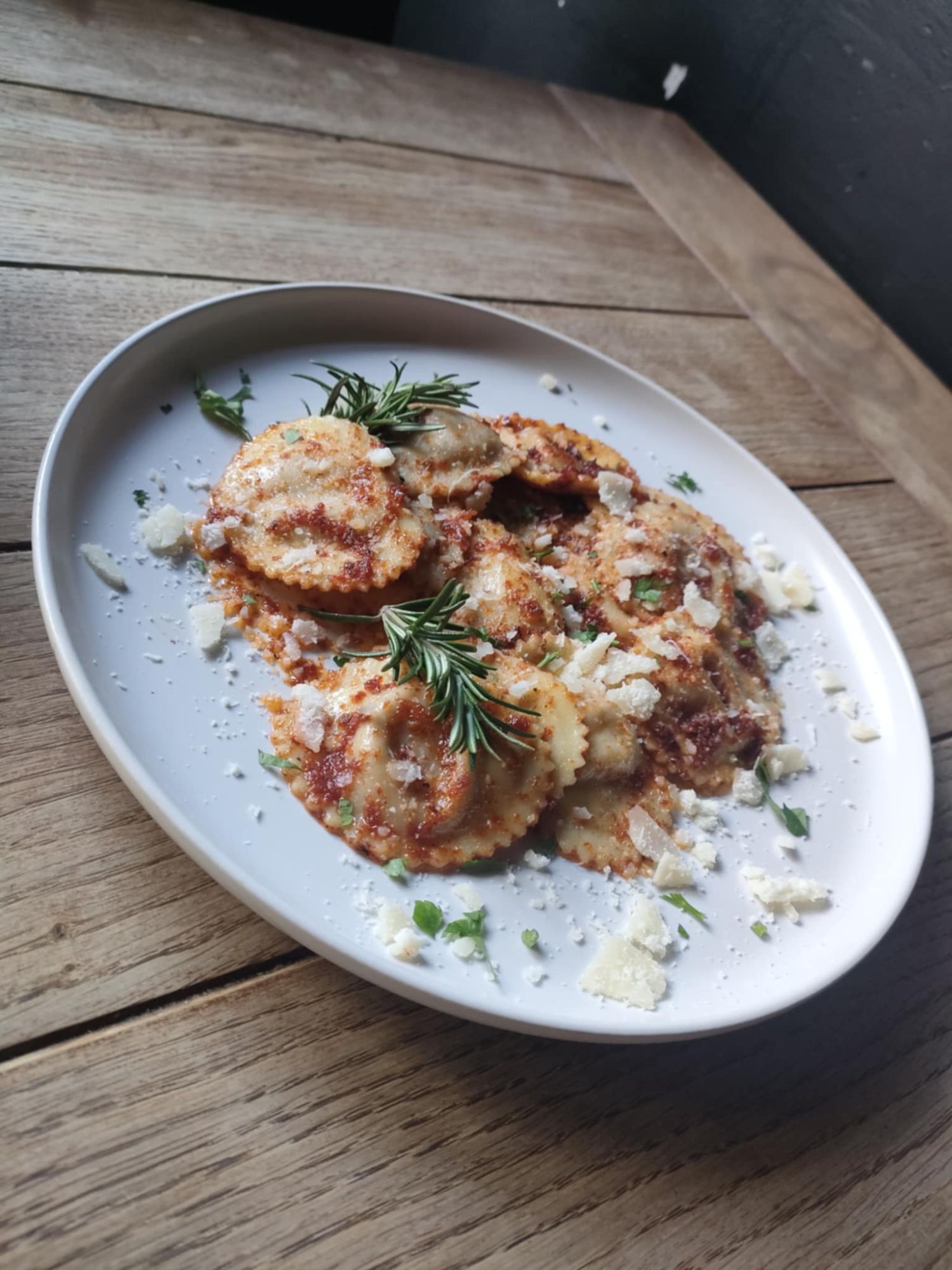 sos pomidorowy z pomidorków pelati, mozzarella, pancetta, zielona pietruszka, bolognese