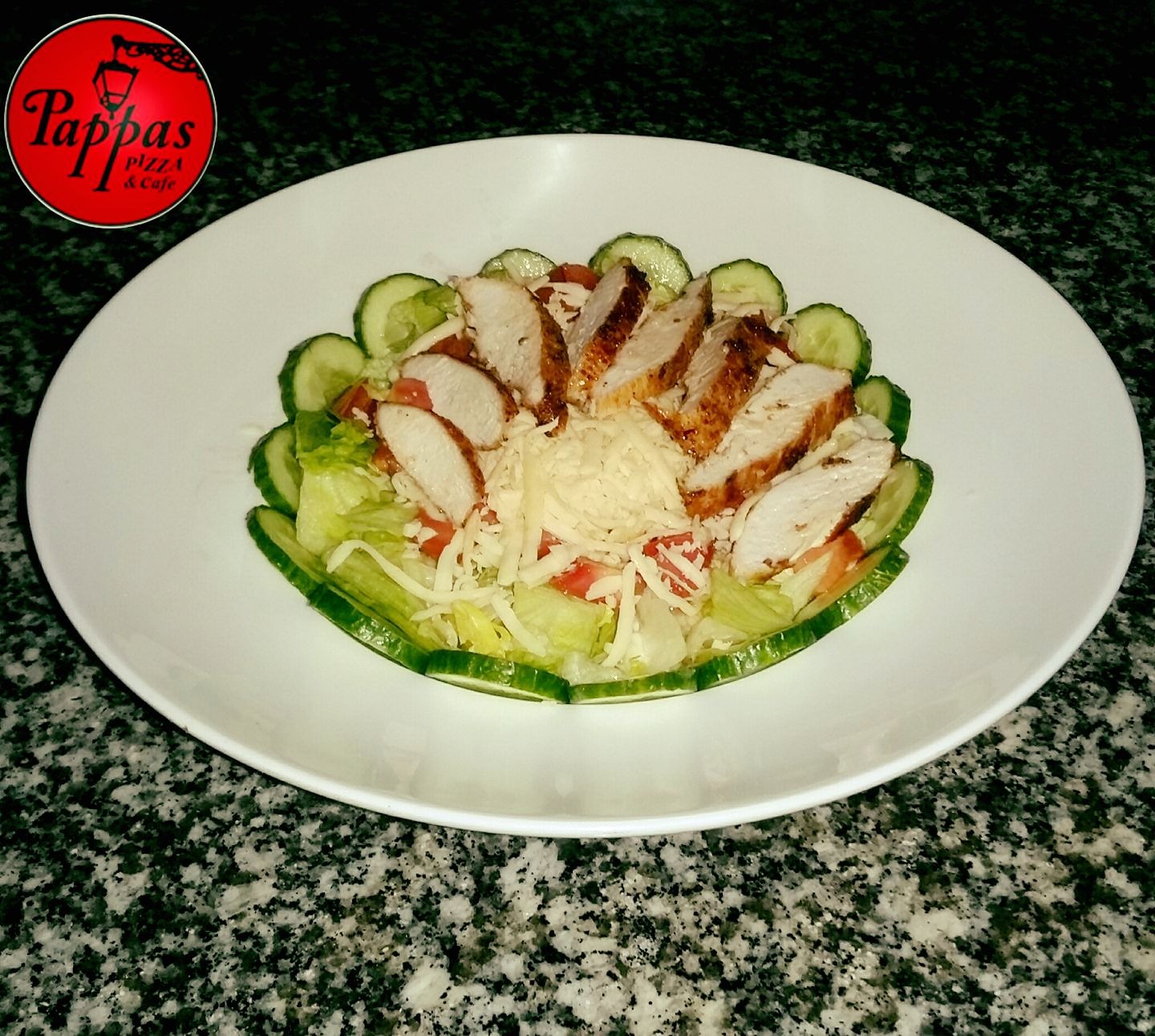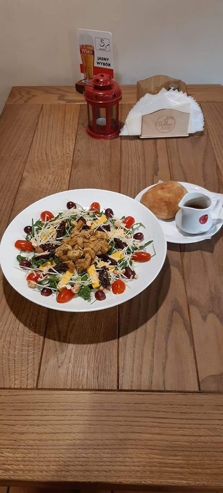 Sałata rzymska, pomidor koktajlowy, cebula czerwona, kurczak grilowany, parmezan, grzanki, sos cezar