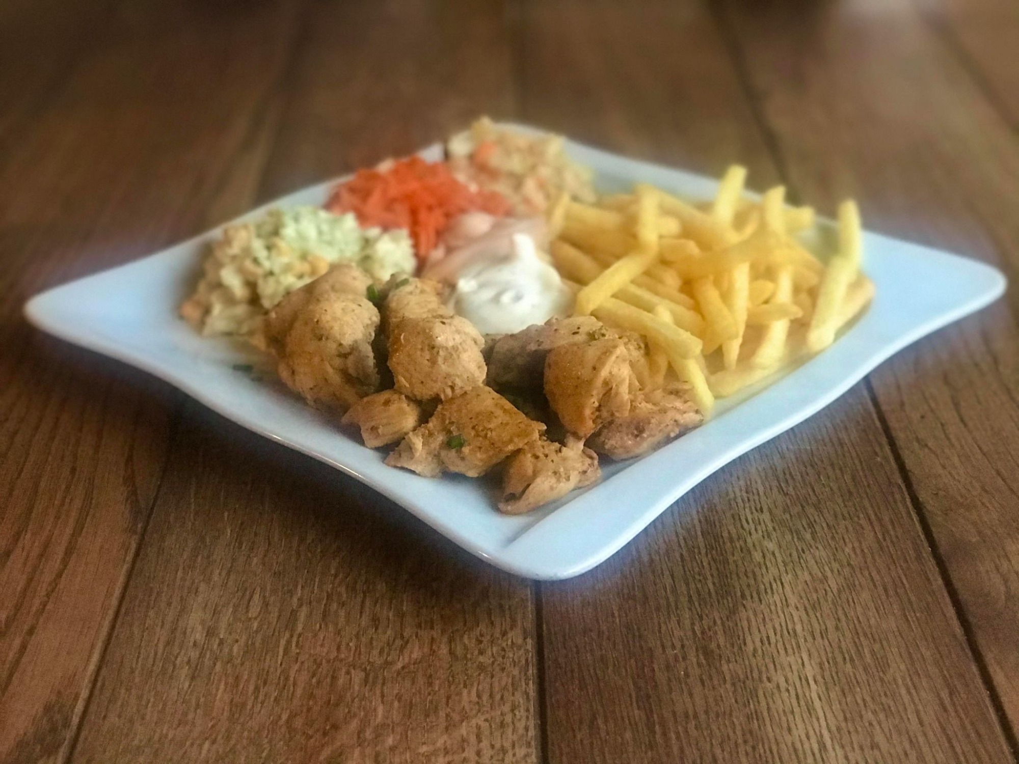 surówki, 2 sosy, frytki lub ziemniaki opiekane -