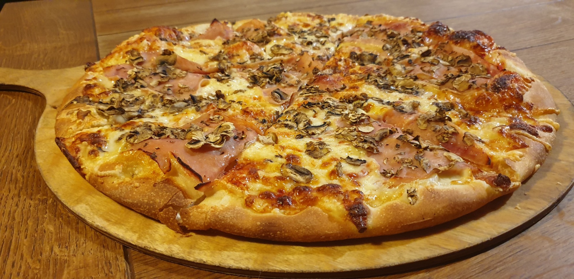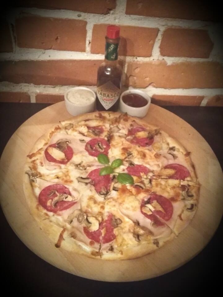 sos, ser, pieczarki, szynka, papryka, ogórek świeży -
