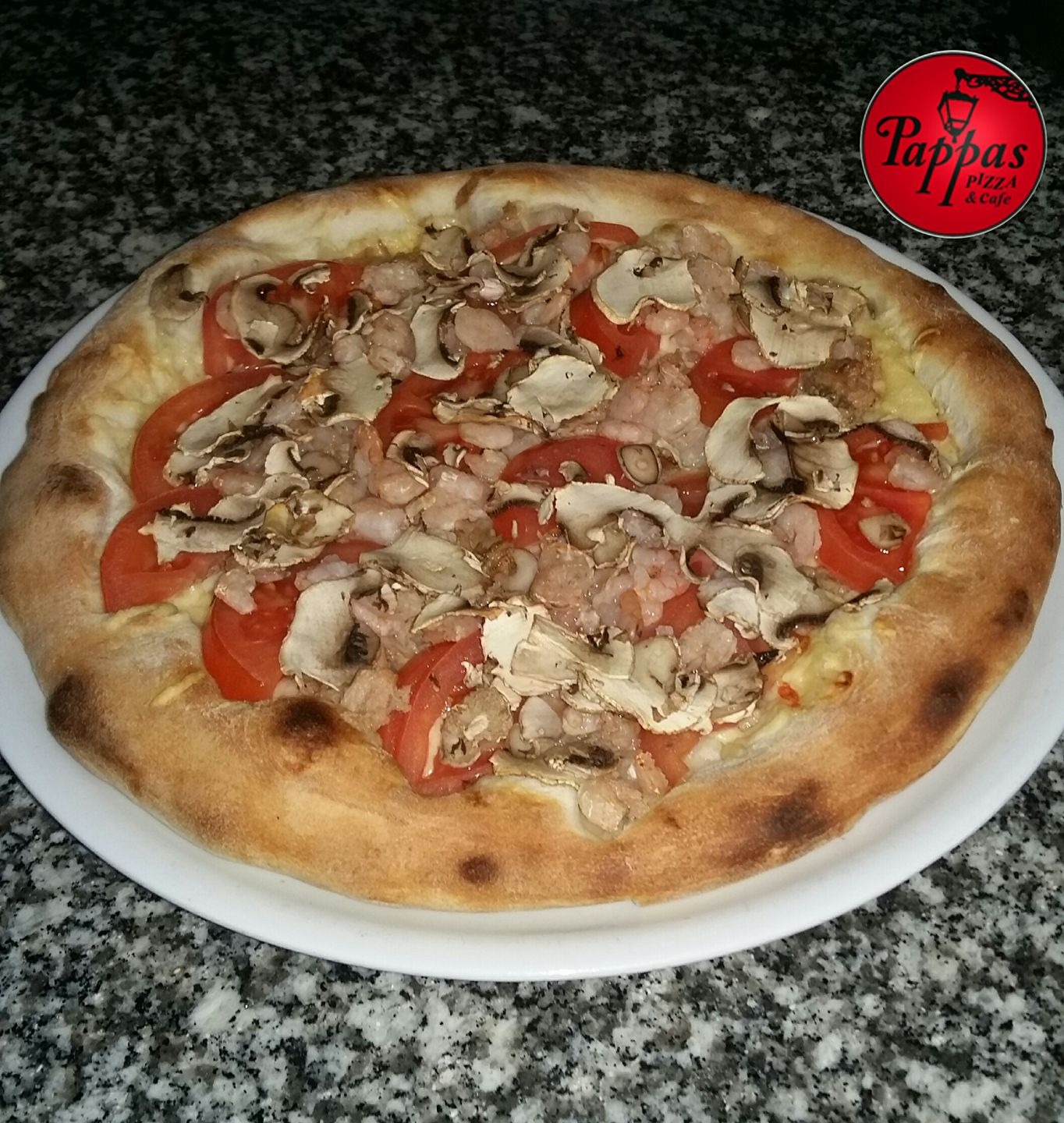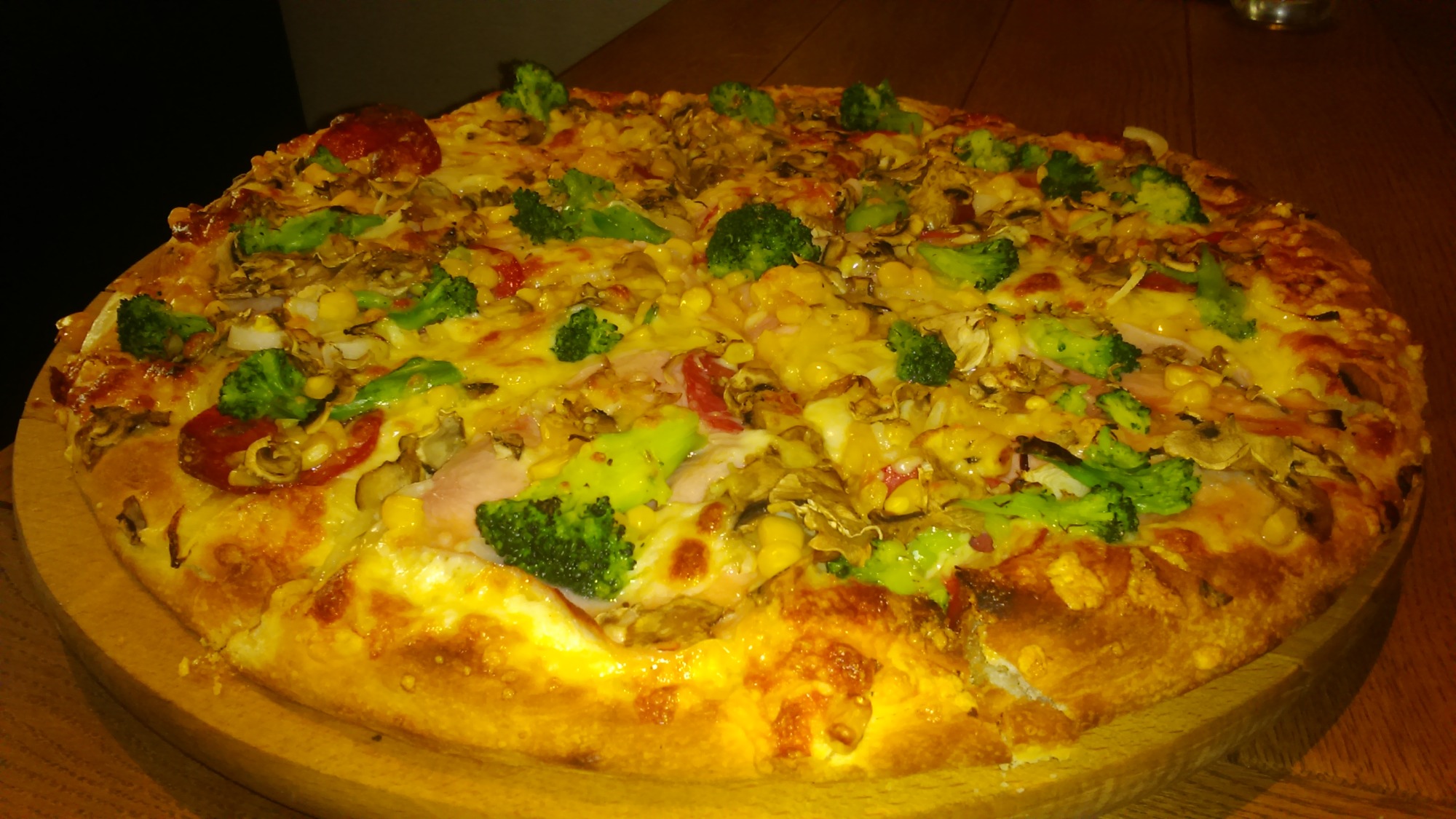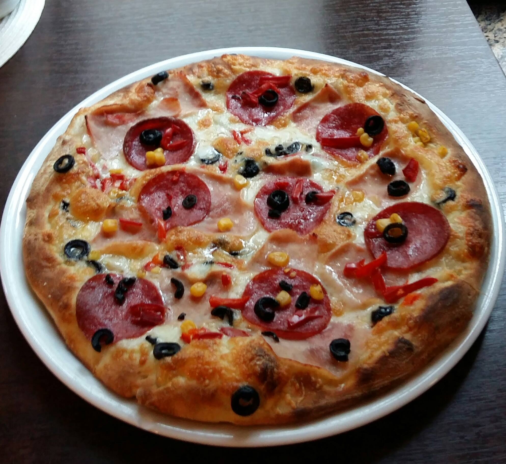 sos, ser, szynka, salami, kukurydza, pieczarki -