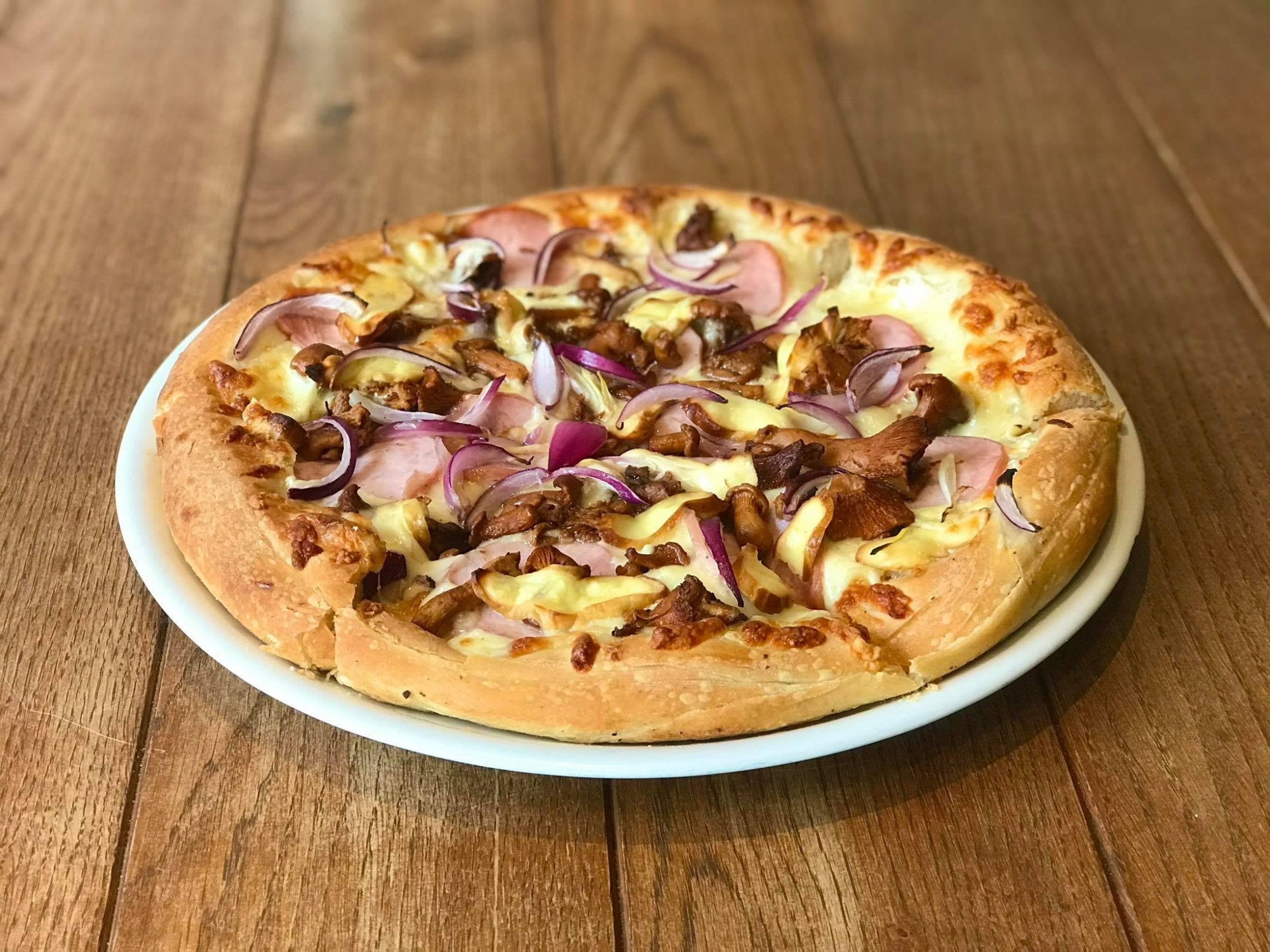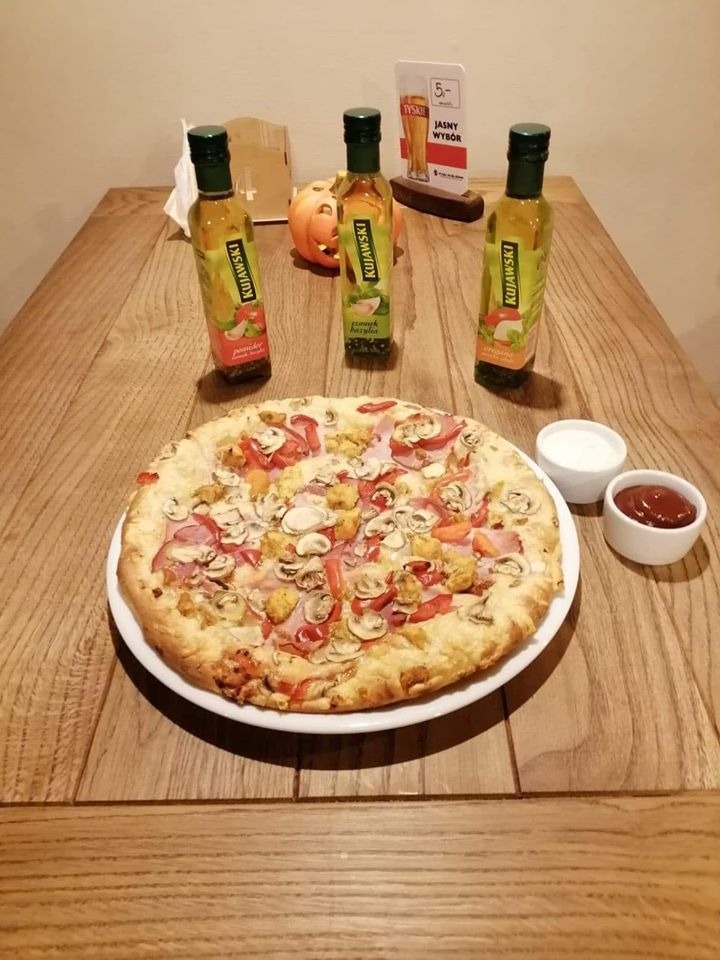 sos, ser, kurczak, szynka, kukurydza, pieczarki, boczek -